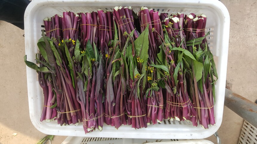 杂交,中熟,主薹粗壮,薹色鲜红,油亮,无蜡粉,光泽度好,薹杆粗细均匀,薹叶少而尖,无苦味且带甜,口感佳。